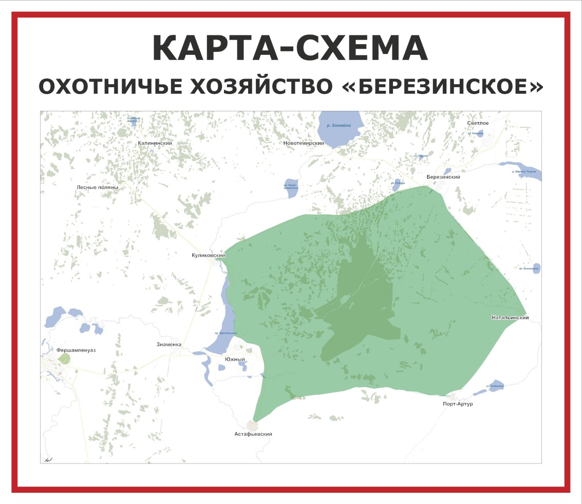 Охотхозяйство ЗОУ «Березинское» находится на территории Чесменского и Нагайбакского районов Челябинской области, в 110 км. от г. Магнитогорск. В пользовании охотхозяйства – площадь 31 200 га, из которых лесных угодий 5 500 га., 25 400 га. степная зона, 200 га. болото.